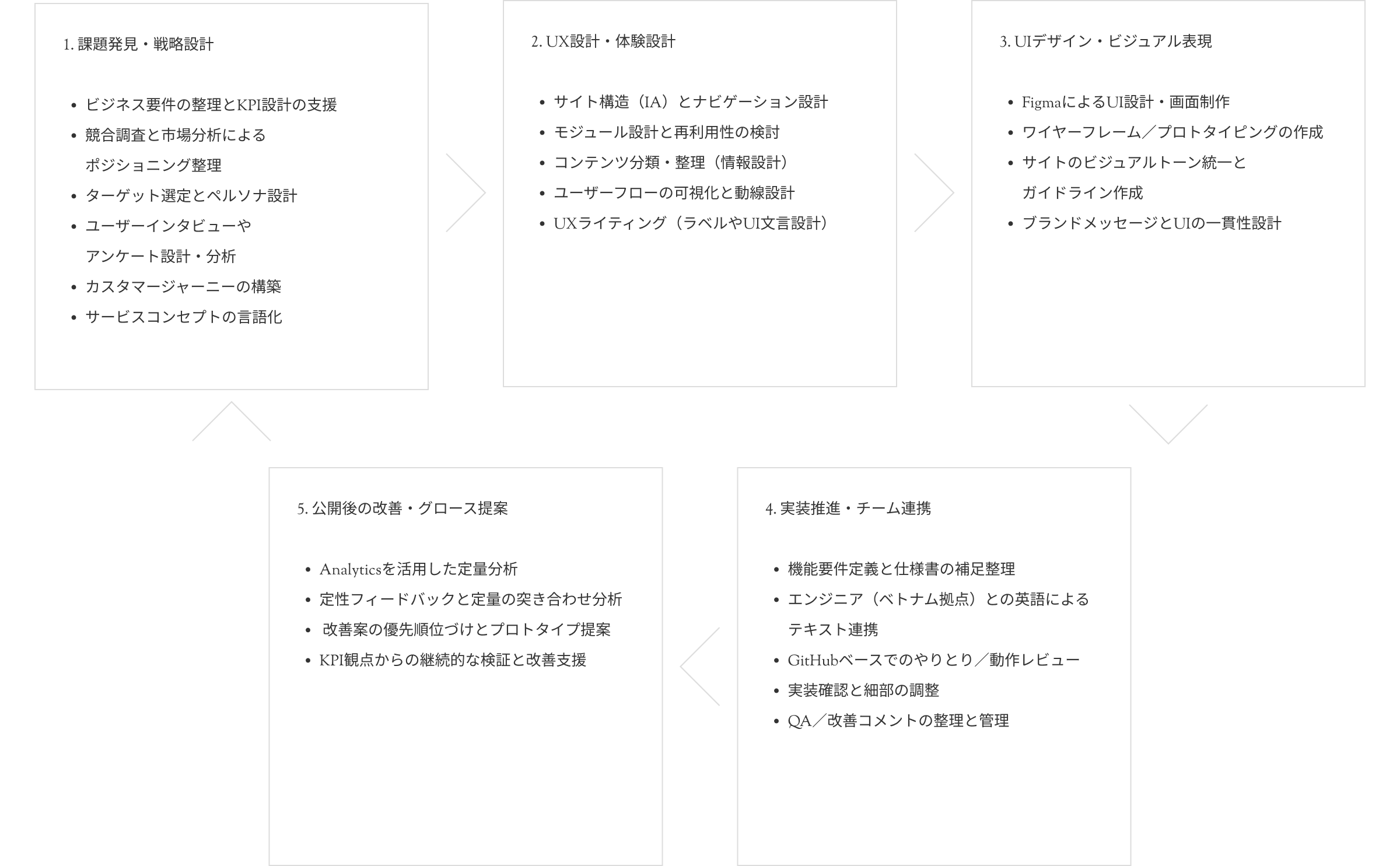 ユーザー導線の整理や構造設計、サービスコンセプトの明確化、UIデザイン、エンジニアとの連携による実装サポート、そして数値分析やユーザーフィードバックに基づく改善提案まで、関係者と連携しながらプロジェクト全体に伴走しました。