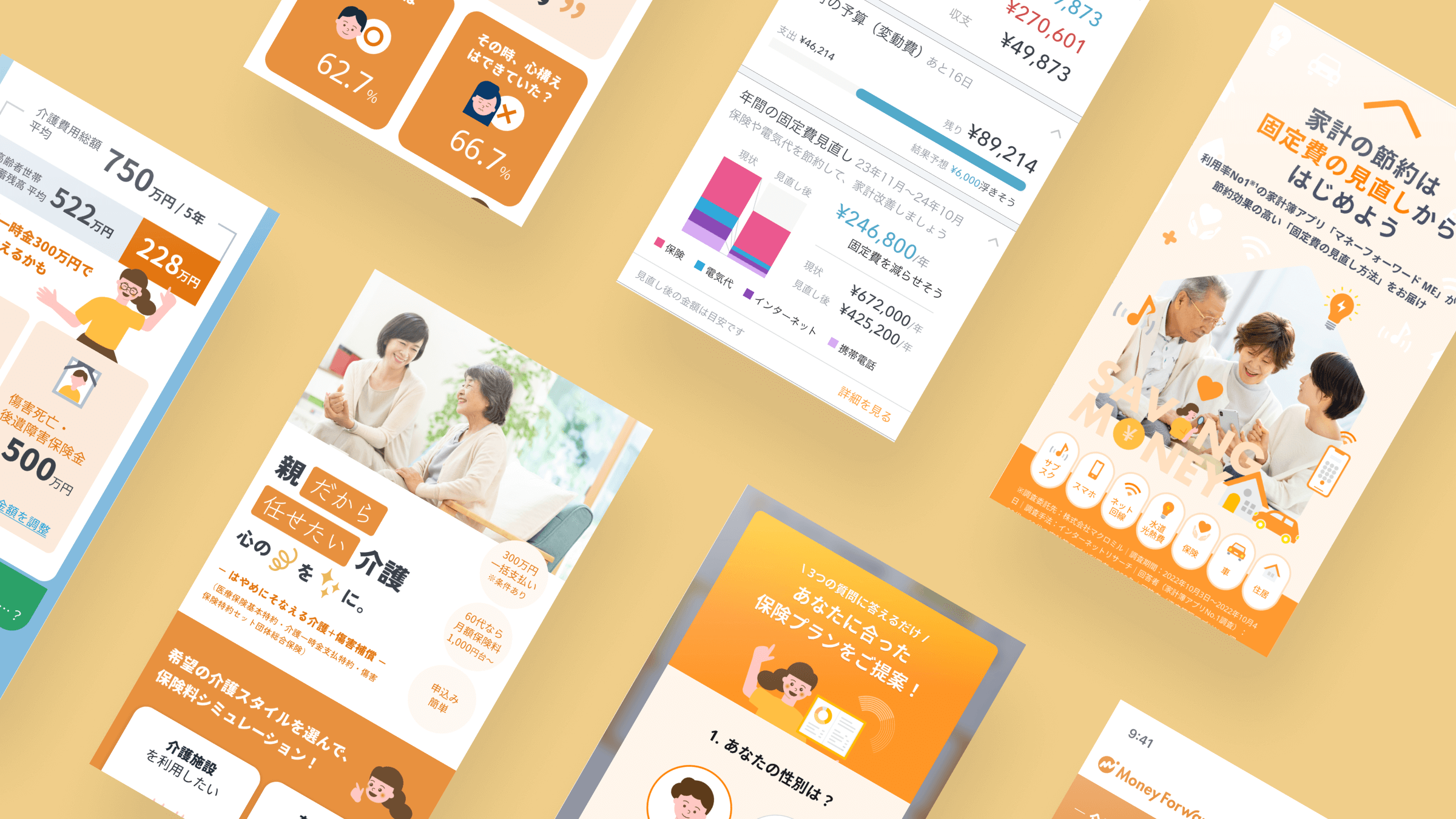 金融・保険関連サービスという特性上、成果物の詳細は非公開とさせていただいておりますが、情報設計・画面設計・ビジュアル制作・実装確認・公開後の改善提案まで、各フェーズに応じて幅広く担当しています。